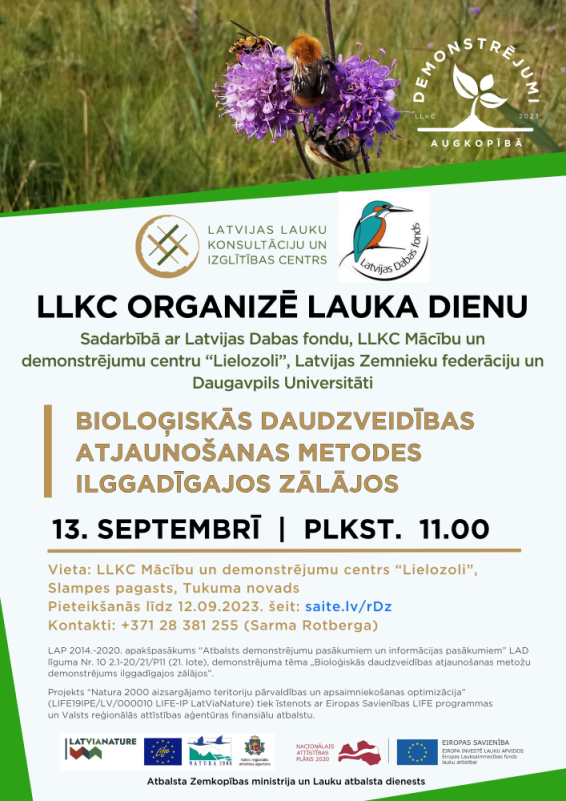 Lai demonstrētu un izvērtētu ilggadīgo zālāju bioloģiskās daudzveidības atjaunošanas metodes un popularizētu pļavas produktu zīmolu, Latvijas Lauku konsultāciju un izglītības centrs sadarbībā ar Latvijas Dabas fondu, LLKC Mācību un demonstrējumu centru “Lielozoli”, Latvijas Zemnieku federāciju un Daugavpils Universitāti aicina apmeklēt lauka dienu.