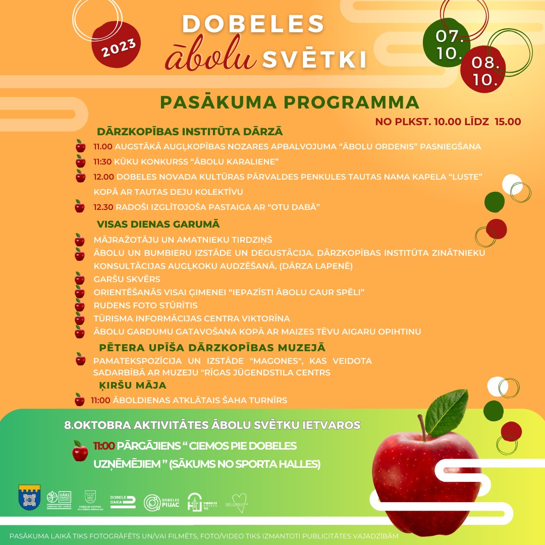 Dārzkopības institūta dārzā no pulksten 10.00 līdz 15.00 norisināsies visdažādākās aktivitātes: radošas, izzinošas, sportiskas, kā arī ābolu nots būs jūtama garšās, noskaņās, uzdevumos un dziesmās.