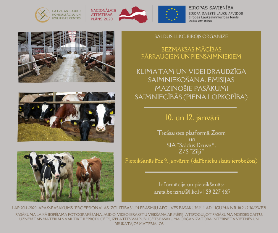 LLKC Saldus konsultāciju birojs aicina Jūs apmeklēt bezmaksas mācības “Klimatam un videi draudzīga saimniekošana. Emisijas mazinošie pasākumi saimniecībās (piena lopkopība)”.