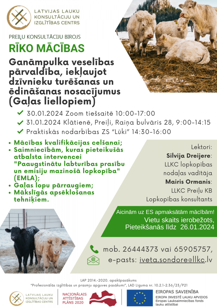 LLKC Preiļu konsultāciju birojs aicina uz 16h bezmaksas mācībām “Ganāmpulka veselības pārvaldība, iekļaujot dzīvnieku turēšanas un ēdināšanas nosacījumus (Gaļas liellopiem)