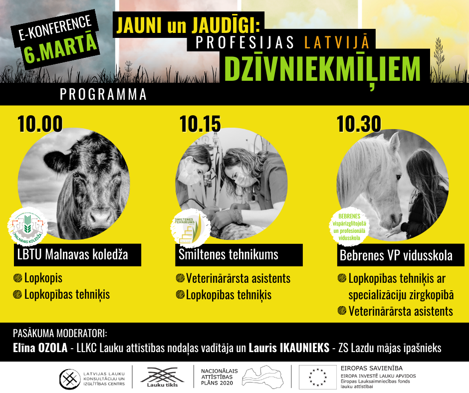 Lai popularizētu lopkopības saimniecībās nepieciešamās profesijas – “Veterinārmedicīnas asistents”, “Lopkopības tehniķis” un “Lopkopības tehniķis ar specializāciju zirgkopībā”, Latvijas Lauku konsultāciju un izglītības centrs (LLKC) skolu jauniešus aicina uz tiešsaistes konferenci “Jauni un jaudīgi: profesijas Latvijā dzīvniekmīļiem”.