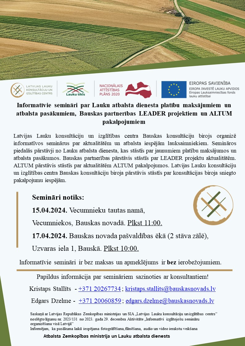 LLKC Bauskas konsultāciju birojs organizē informatīvo semināru par aktualitātēm un atbalsta iespējām lauksaimniekiem.