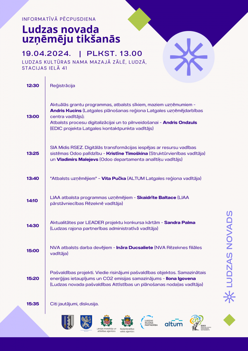 19. aprīlī plkst. 13.00 Ludzas Kultūras nama mazajā zālē, Ludzā, Stacijas ielā 41 notiks informatīvs pasākums Ludzas novada uzņēmējiem. Uz pasākumu aicina Ludzas novada pašvaldība sadarbībā ar Latgales plānošanas reģiona Latgales uzņēmējdarbības centru. Pasākumā uzstāsies un par uzņēmējdarbības aktualitātēm informēs pārstāvji no Latgales plānošanas reģiona, Latvijas Investīciju un attīstības aģentūras (LIAA), Nodarbinātības valsts aģentūras (NVA), Ludzas rajona partnerības un Valsts attīstības finanšu institūcijas Altum.
