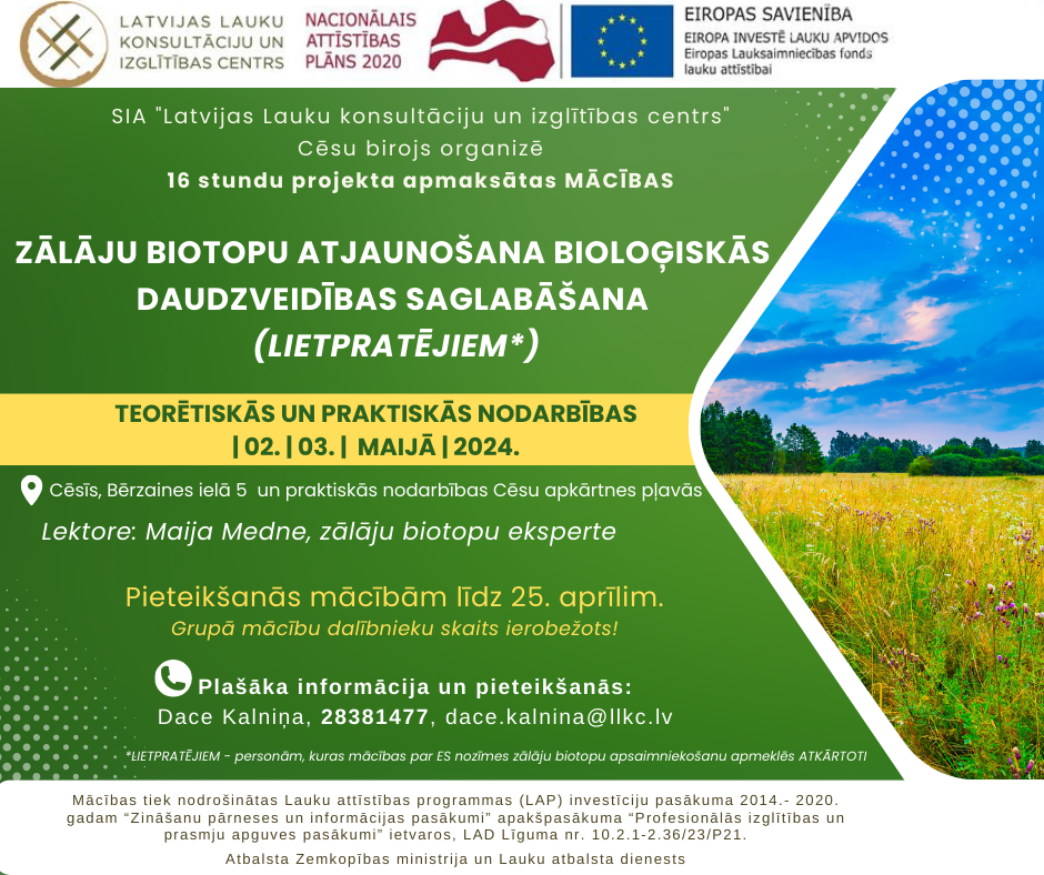 LLKC Cēsu birojs aicina uz mācībām zālāju biotopu īpašniekus un apsaimniekotājus uz 16 stundu projekta apmaksātām mācībām "Zālāju biotopu atjaunošana bioloģiskās daudzveidības saglabāšanai (t.sk. ar nodarbību dabā, atjaunotajos zālājos) (lietpratējiem*)"