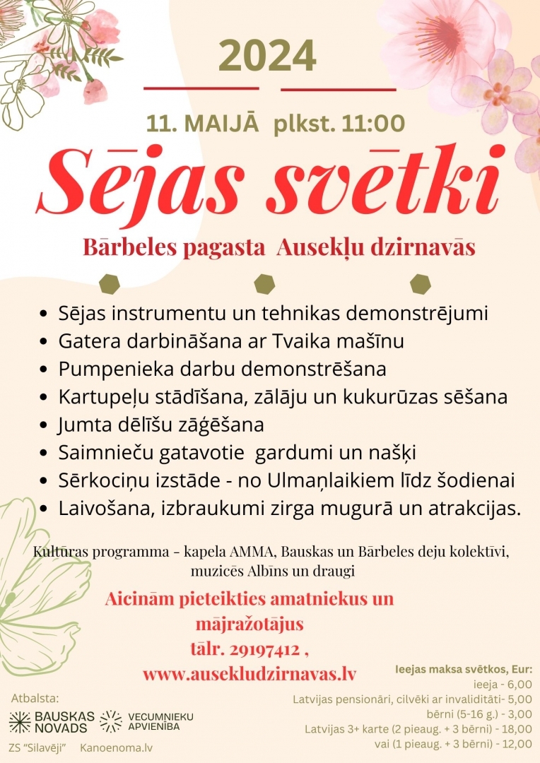 Aicinām ikvienu seno amatu pratēju, amatnieku un citus interesentus 11. maijā svētku dalībnieku pulkā. Amatniekiem un mājražotājiem pieteikties līdz 2024. gada 30. aprīlim pa tālr. 29197412.