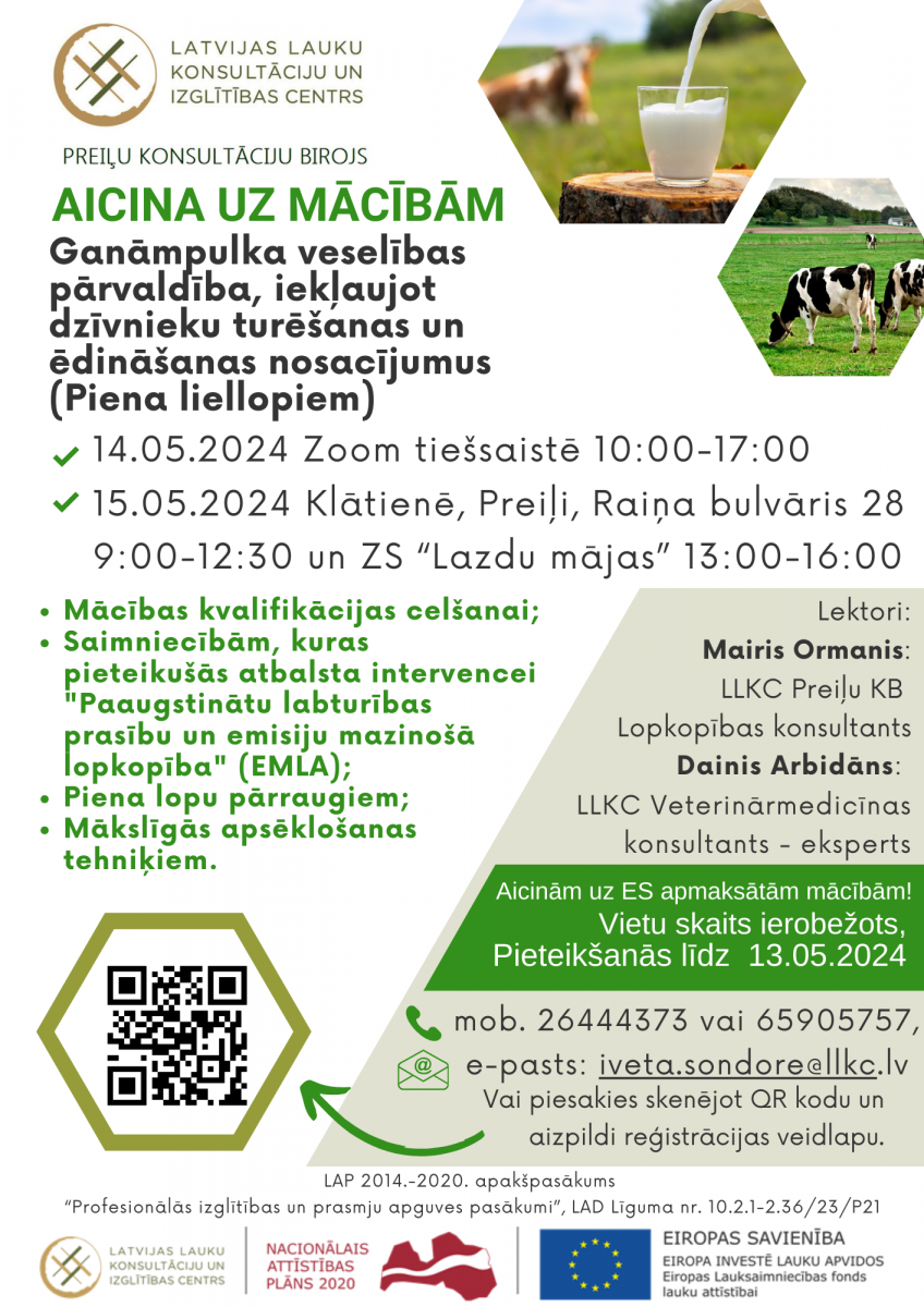 Mācības: "Ganāmpulka veselības pārvaldība, iekļaujot dzīvnieku turēšanas un ēdināšanas nosacījumus" (Piena lopiem).