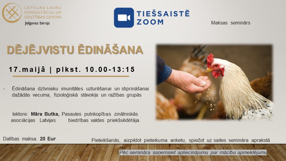 lektore: Māra Butka, Pasaules putnkopības zinātniskās asociācijas Latvijas biedrības valdes priekšsēdētāja, dalības maksa seminārā 20 Eur, pieteikšanās, spiežot uz saites: https://forms.gle/WT5KLgnySBhR4Gys8