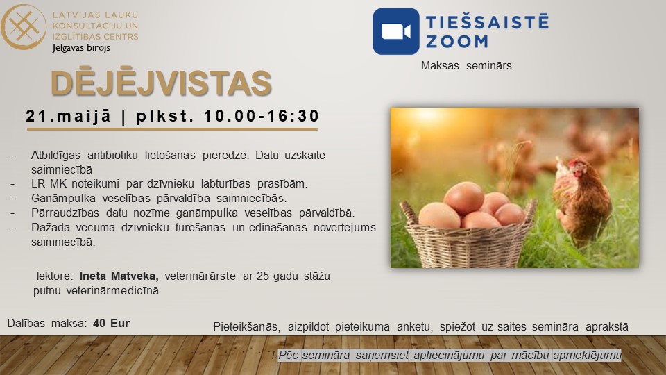 LLKC Jelgavas birojs piedāvā maksas seminārus par dējējvistu turēšanu un audzēšanu tiešsaistē Zoom platformā: