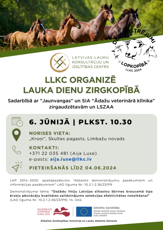 LLKC sadarbībā ar Māra Parfianoviča (Jaunvangas, Siguldas pagasts, Siguldas novads) un Ingas Jaunzares (SIA “Ādažu veterinārā klīnika”, Kroņi, Skultes pagasts, Limbažu novads) zirgaudzētavām un Latvijas šķirnes zirgu audzētāju asociāciju rīko lauka dienu.