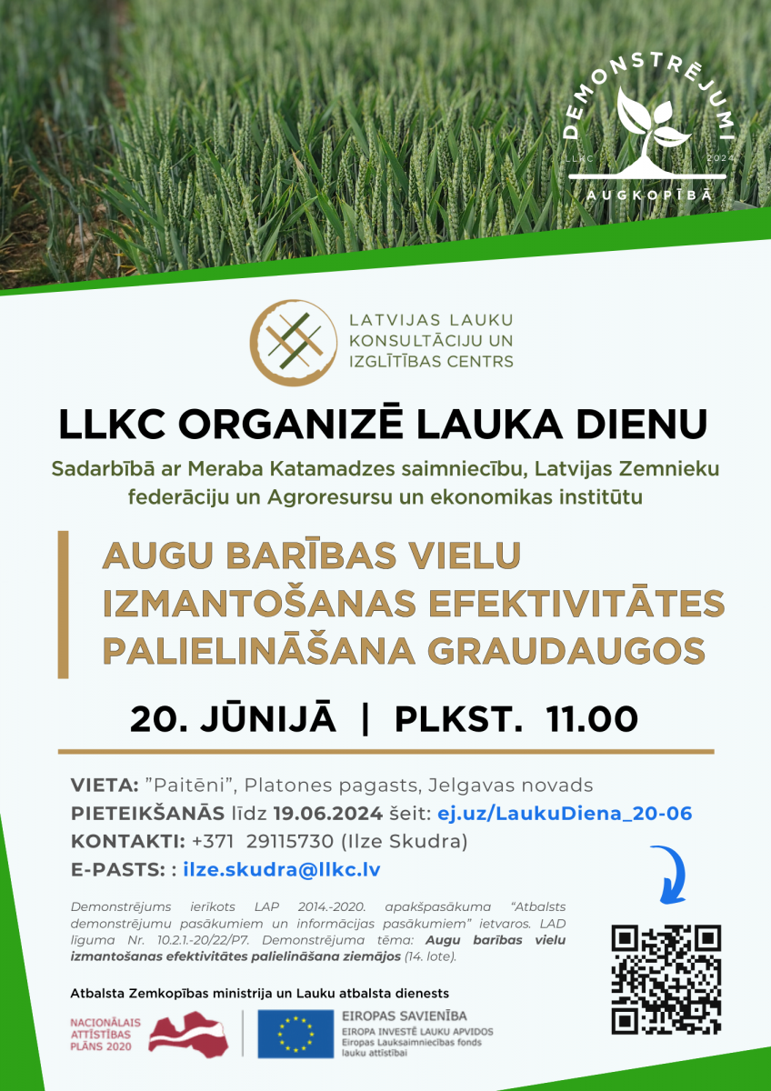 Lai novērtētu augu barības vielu izmantošanās efektivitāti graudaugos, LLKC sadarbībā ar Meraba Katamadzes saimniecību (Platones pagasts, Jelgavas novads), Latvijas Zemnieku federāciju un Agroresursu un ekonomikas institūtu aicina apmeklēt lauka dienu.