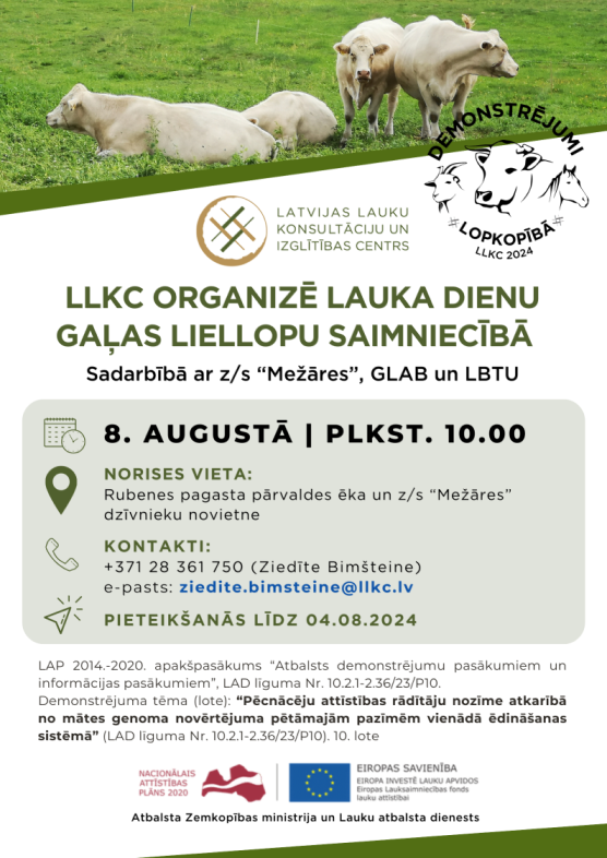 LLKC sadarbībā ar z/s “Mežāres”, GLAB un LBTU aicina 8. augustā apmeklēt demonstrējuma lauka dienu par pēcnācēju attīstības rādītājiem atkarībā no mātes genoma novērtējuma pētāmajām pazīmēm vienādā ēdināšanas sistēmā.