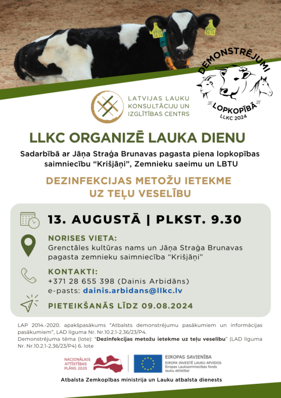 LLKC sadarbībā ar Jāņa Straģa Brunavas pagasta piena lopkopības zemnieku saimniecību “Krišjāņi”, Zemnieku saeimu un LBTU aicina 13. augustā  apmeklēt demonstrējuma lauka dienu piensaimniecībā par dezinfekcijas metožu ietekmi uz teļu veselību.