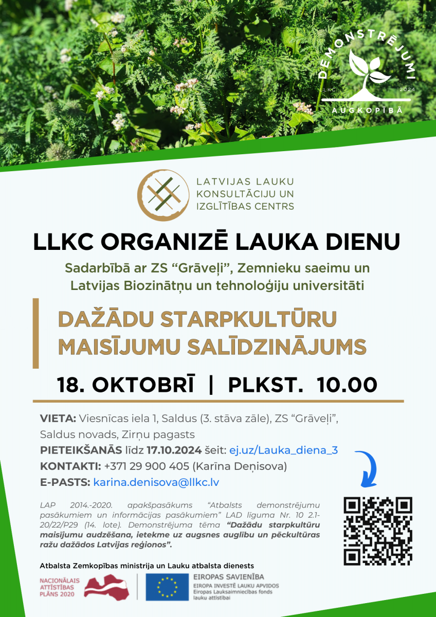 LLKC sadarbībā ar z/s “Grāveļi” (Zirņu pagasts, Saldus novads), Zemnieku saeimu un Latvijas Biozinātņu un tehnoloģiju universitāti aicina apmeklēt lauka dienu “Dažādu starpkultūru maisījumu salīdzinājums”.