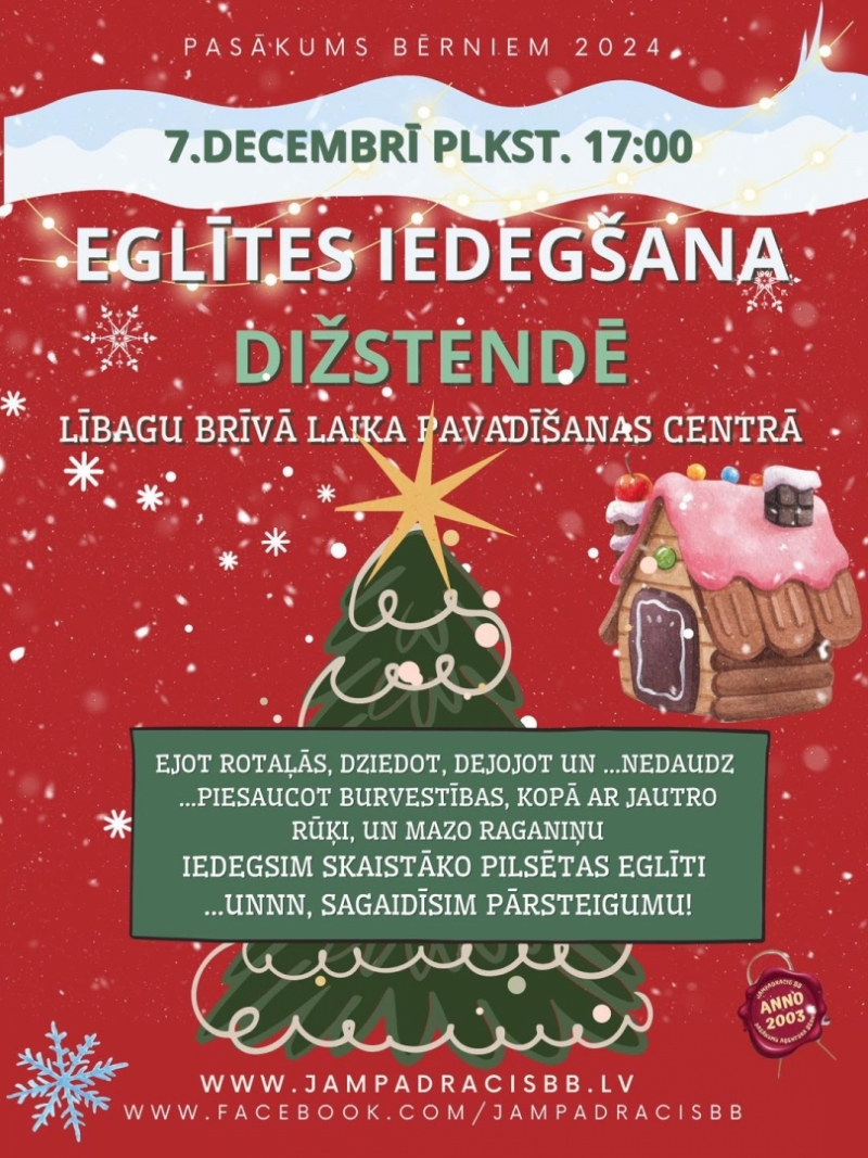 Datums: 7. Decembris, 2024Reģions: Talsu novadsVieta: DižstendeAdrese: Skatīt karti lielākā izmērā Aicinam apmeklēt eglītes iedegšanu Dižstendē 7. decembrī. Kontaktinformācija: Katrīna KļimovskaPielikums: PielikumsIzmērs eglites-iedegsanas-libagos-afisa_1.jpg603.1 KB Reģions filtram: Talsu novads