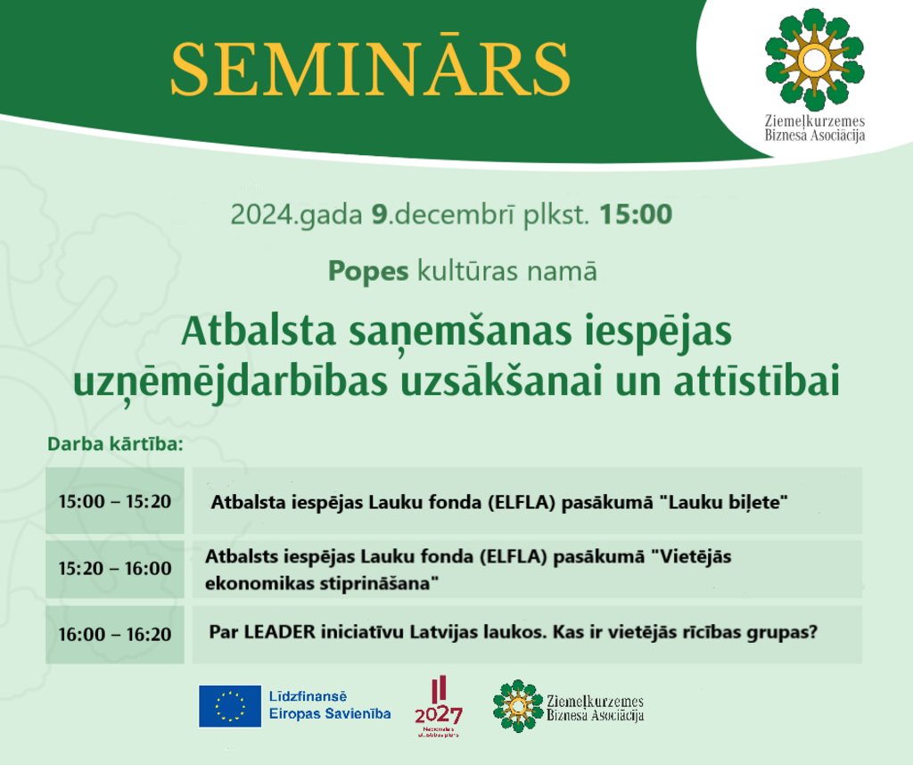 Aicinam apmeklēt 9.decembrī plkst.15.00 -16.30 Popes kultūras namā Ventspils novada Popē notiks seminārs par iespējām iesniegt projektu un saņemt atbalstu no Lauku fonda (ELFLA).