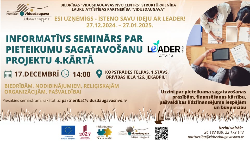 aicina uz informatīvo semināru par LEADER projekta pieteikuma sagatavošanu 4.kārtā!