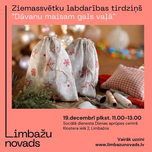 19.decembrī no plkst. 11.00 līdz 13.00 Sociālā dienesta Dienas aprūpes centrā, Klostera ielā 2, Limbažos, tradicionāli darbosies Ziemassvētku labdarības tirdziņš "Dāvanu maisam gals vaļā".