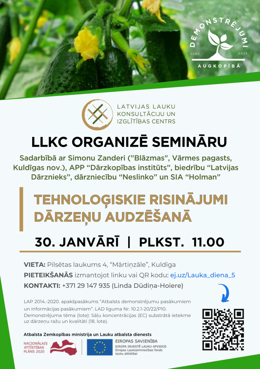 LLKC sadarbībā ar Simonu Zanderi ("Blāzmas", Vārmes pagasts, Kuldīgas novads), APP “Dārzkopības institūts”, biedrību “Latvijas Dārznieks”, dārzniecību “Neslinko” un SIA “Holman” rīko semināru “Tehnoloģiskie risinājumi dārzeņu audzēšanā”.
