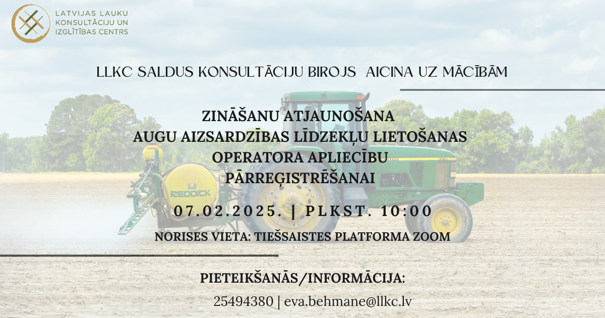 LLKC Saldus konsultāciju birojs organizē mācību kursu "Zināšanu atjaunošana augu aizsardzības līdzekļu operatoru apliecību pārreģistrēšanai (atjaunošanai)".