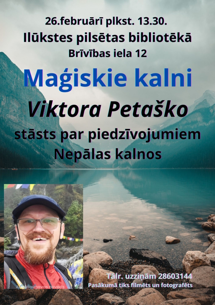 Datums: 26. Februāris, 2025Reģions: LatgaleVieta: Ilūkstes pilsētās bibliotēkāAdrese: Skatīt karti lielākā izmērā 26.02.2025., plkst.: 13.30, "Maģiskie klani" Viktora Petaško stāsts par piedzīvojumiem Nepālas kalnos. Kontaktinformācija: Tālr.: 28603144Reģions filtram: Augšdaugavas novads