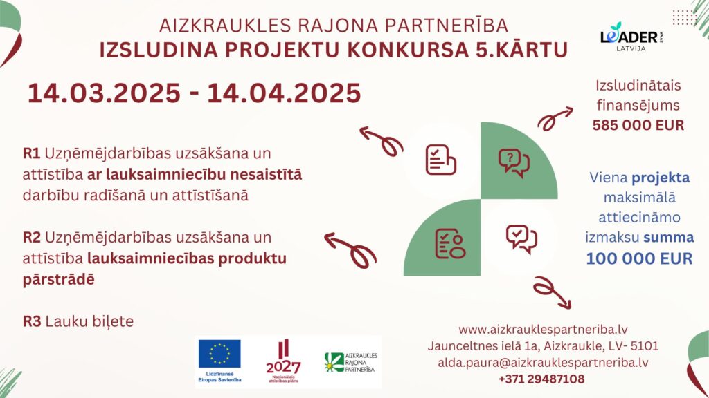 UZMANĪBU! Stratēģijas grozījumi paredz, ka rīcībās R1 un R2, sākot ar 5.kārtu, viena projekta maksimālo attiecināmo izmaksu summa ir paaugstināta no 50 000 uz 100 000 EUR!