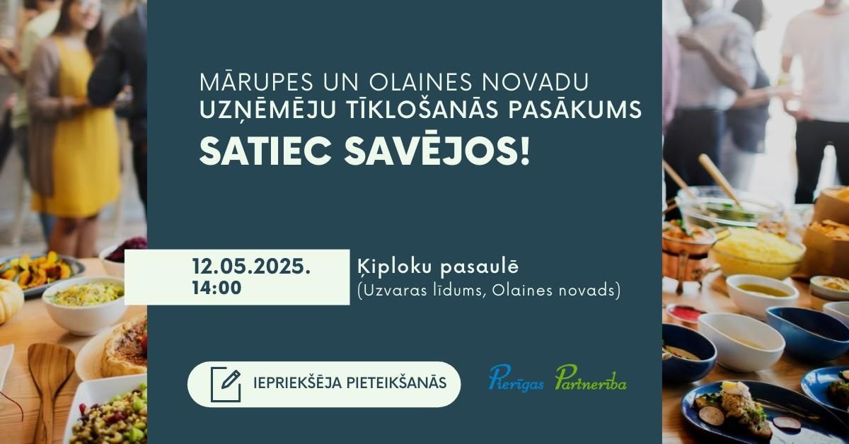 13.maijā plkst.14.00 “Pierīgas Partnerība” aicina uz Mārupes un Olaines novadu uzņēmēju tīklošanās pasākumu “Satiec savējos!”, kura mērķis ir veicināt uzņēmēju iepazīšanos.
