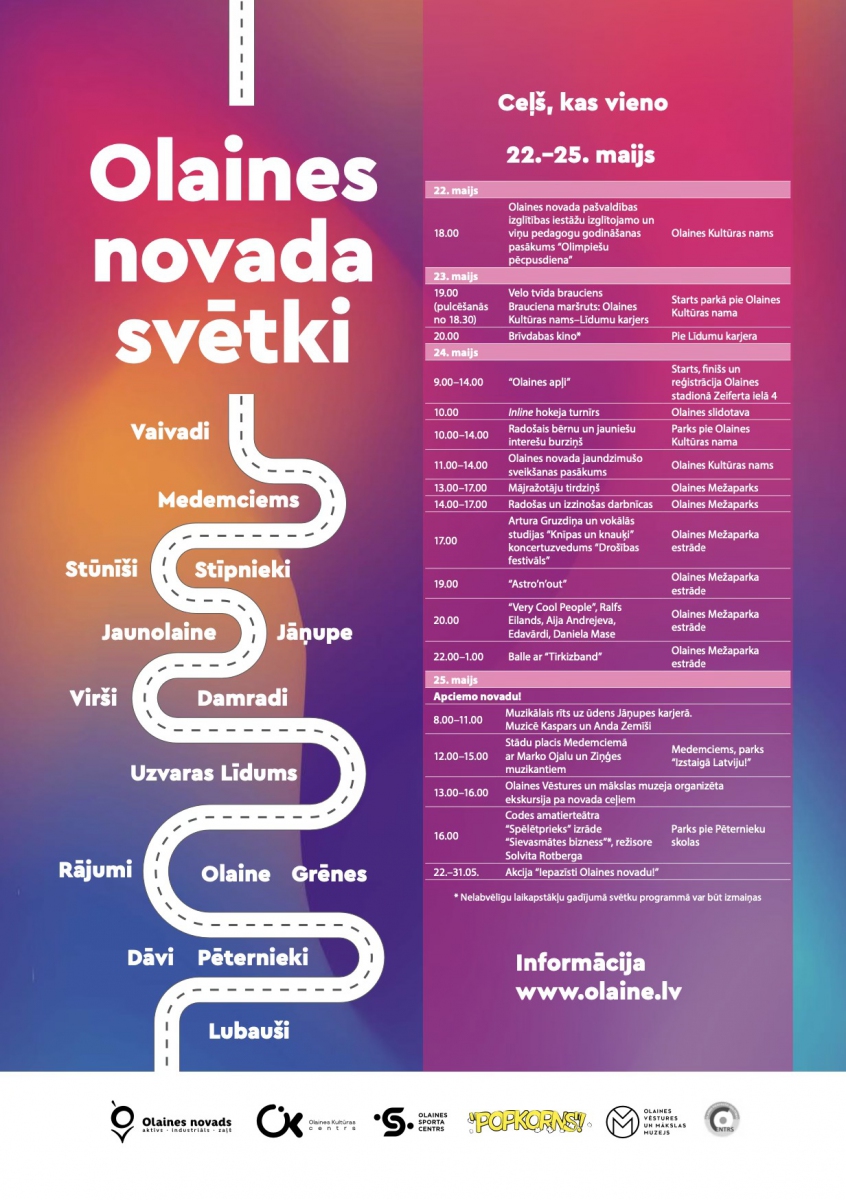 - Olaines apļi Starts, finišs un reģistrācija Olaines stadionā; Inline hokeja turnīrs; Radošais bērnu un jauniešu interešu BURZIŅŠ; Olaines novada jaundzimušo sveikšanas pasākums; Mājražotāju tirdziņš; Radošās un izzinošās darbnīcas; Artura Gruzdiņa un “Knīpas un knauķi” koncertuzvedums “Drošības festivāls”; grupas "ASTRO’N’OUT" un VERY COOL PEOPLE, Ralfs Eilands, Aija Andrejeva, Edavārdi, Daniela Mase brīvdabas koncerts (24.05.2025.);