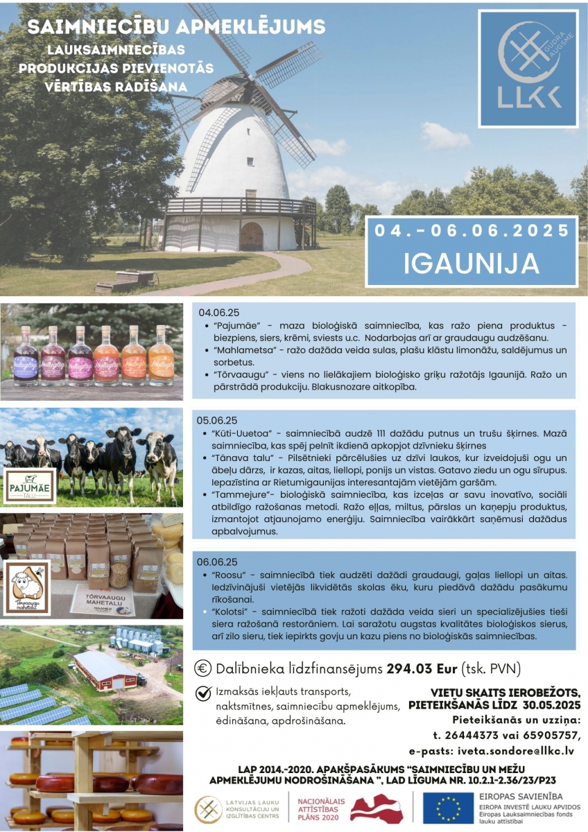 Izmaksās iekļauts transports, naktsmītnes, saimniecību apmeklējums, ēdināšana, apdrošināšana.