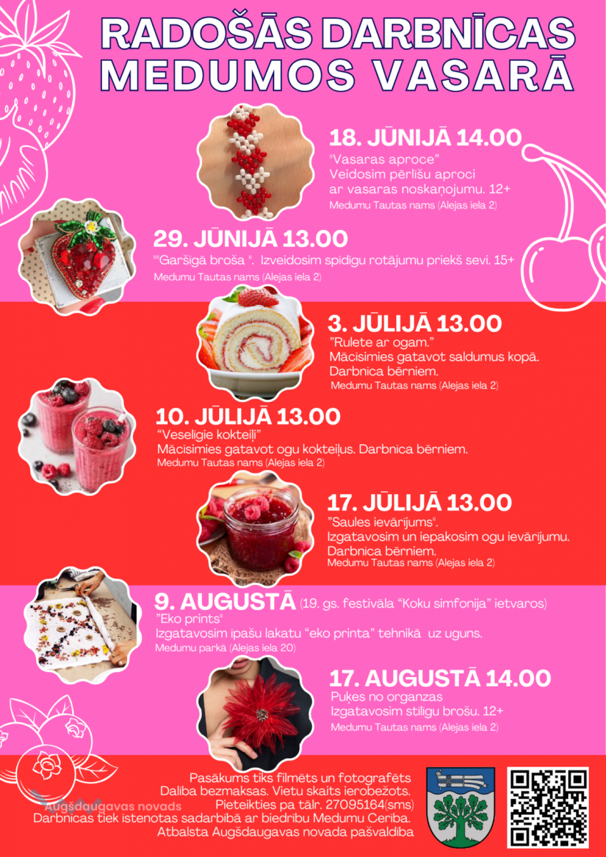Šovasar aicinām uz ogām bagātām radošajām darbnīcām Medumos – gan pieaugušajiem, gan bērniem! Radīsim ogas mākslās darbos – krāsainas, spilgtas un iedvesmojošas. Gatavosim arī gardumus no svaigām ogām – saldi, veselīgi un ar prieku. Nāc un piedzīvo ogu pilnu vasaru kopā ar mums.