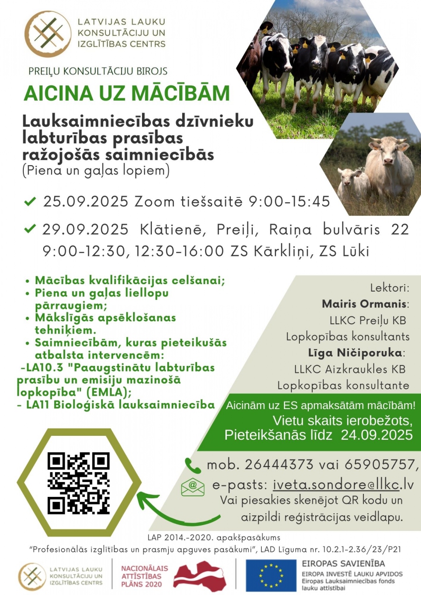 LLKC Preiļu konsultāciju birojs piedāvā mācības "Lauksaimniecības dzīvnieku labturības prasības ražojošās saimniecībās" (Piena un gaļas lopiem). Šogad pēdējā iespēja pieteikties 100% ES apmaksātām mācībām.