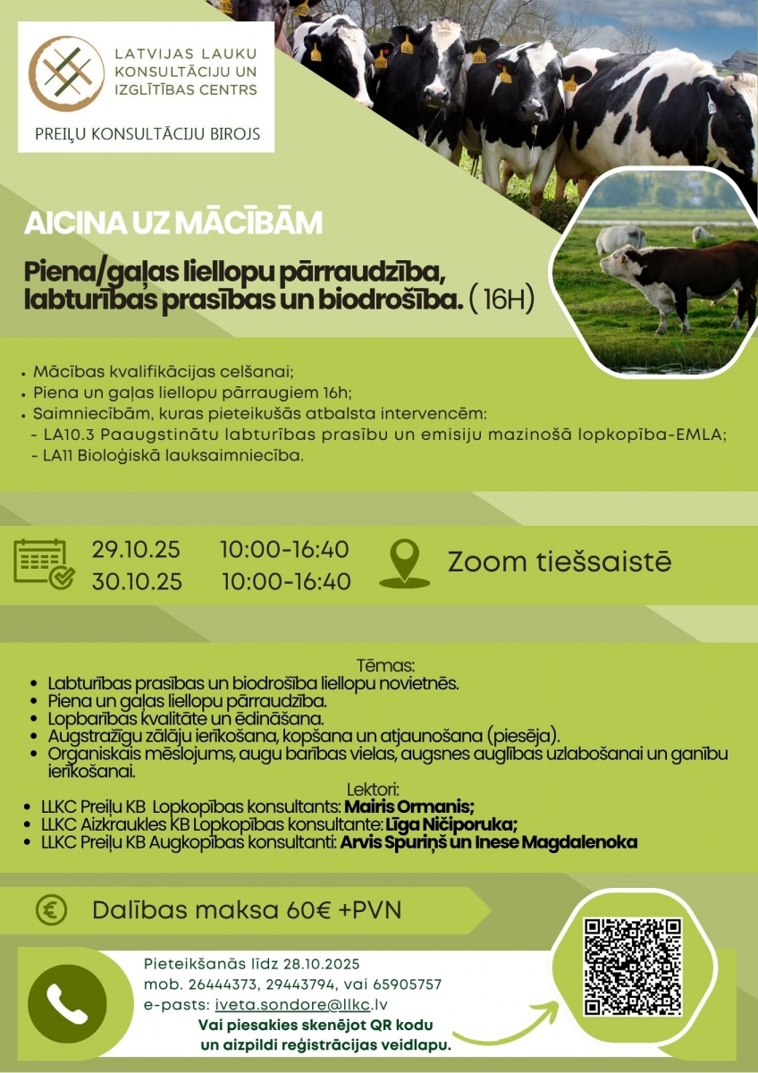 LLKC Preiļu konsultāciju birojs aicina uz mācībām: Piena/gaļas liellopu pārraudzība, labturības prasības un biodrošība. ( 16H)