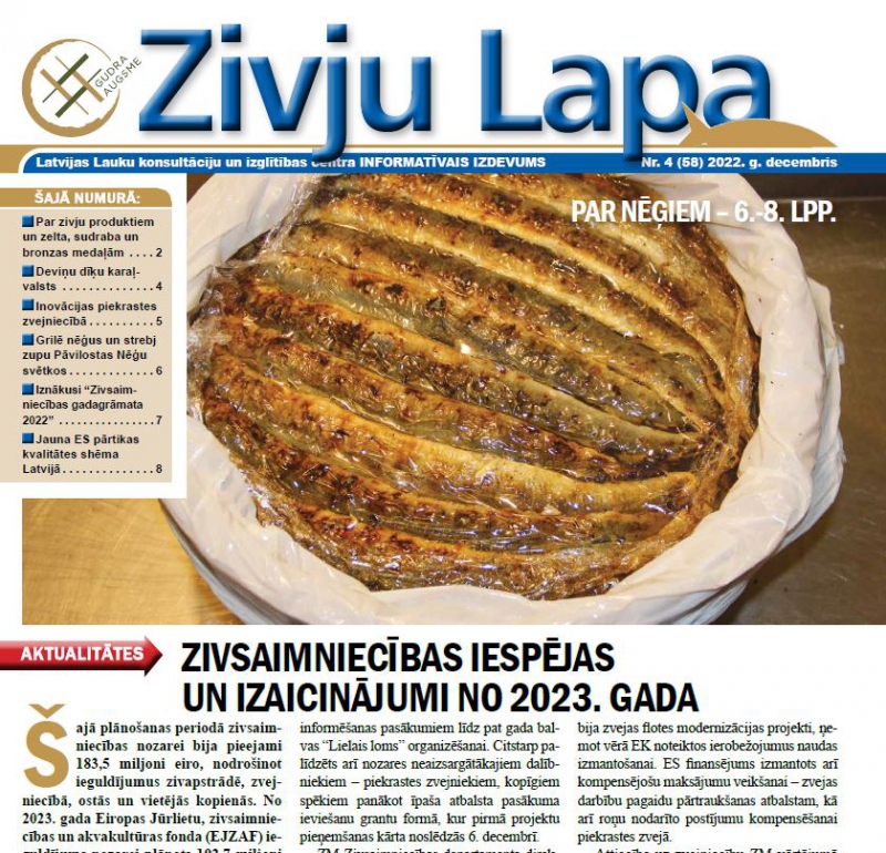 Informatīvā izdevuma “Zivju Lapa” decembra numurā par Zivsaimniecības iespējām un izaicinājumiem no 2023. gada, par paveikto un turpmāk darāmo. Tas tika runāts decembra sākumā notikušajā zivsaimniecības nozares konferencē. Šajā plānošanas periodā zivsaimniecības nozarei bija pieejami 183,5 miljoni eiro, nodrošinot ieguldījumus zivapstrādē, zvejniecībā, ostās un vietējās kopienās. No 2023. gada Eiropas Jūrlietu, zivsaimniecības un akvakultūras fonda (EJZAF) ieguldījums nozarei plānots 192,7 miljoni eiro.