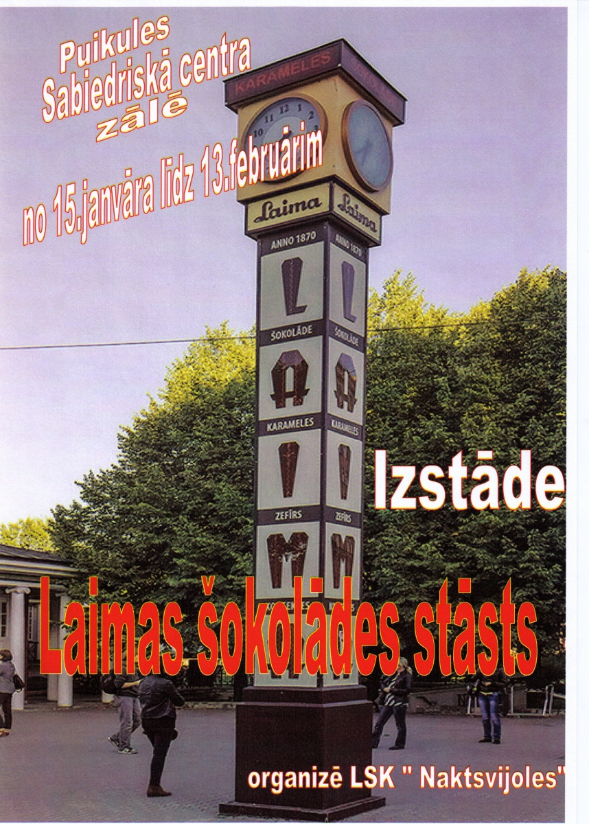Datums: 15. Janvāris, 2015 līdz 13. Februāris, 2015Vieta: Brīvzemnieku pag. PuikuleAdrese: Skatīt karti lielākā izmērā Nozare: PārtikaAlojas novada Puikulē "Sabiedriskā centra" zālē no 15.janvāra līdz 13.februārim tiks atvērta izstāde "Laimas šokolādes stāsts". Reģions filtram: * Alojas novads