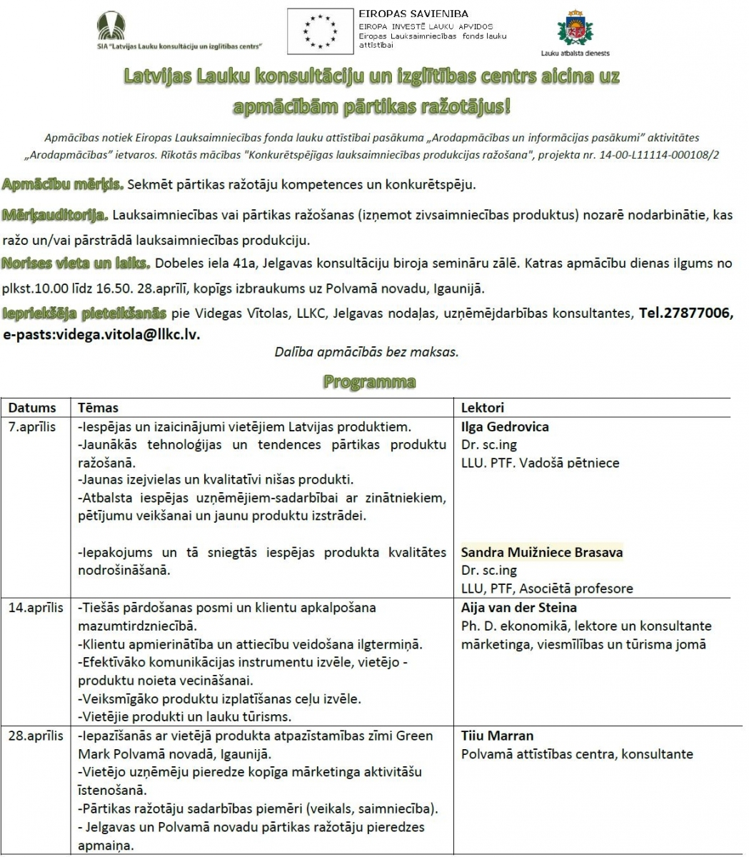 Datums: 7. Aprīlis, 2015Reģions: ZemgaleVieta: Jelgavas konsultāciju biroja zālēAdrese: Skatīt karti lielākā izmērā Nozare: PārtikaKategorija: LLKCReģions filtram: Jelgava