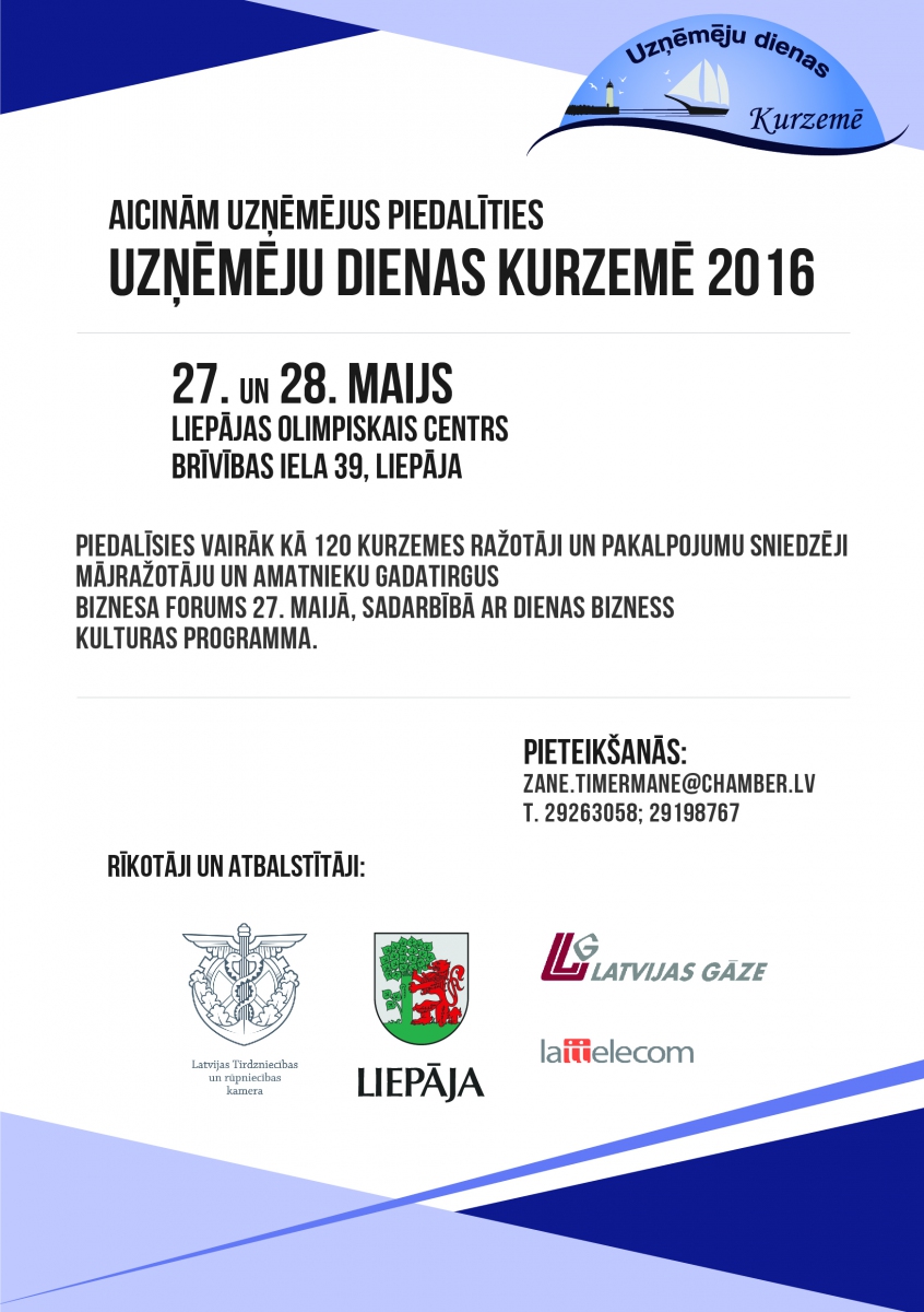 Kurzemes uzņēmējus, amatniekus un mājražotājus aicina parādīt sevi un iepazīt citus.Liepājas Olimpiskajā centrā 27. un 28. maijā notiks Latvijas Tirdzniecības un rūpniecības kameras un Liepājas pilsētas pašvaldības rīkotais pasākums “Uzņēmēju dienas Kurzemē 2016”.