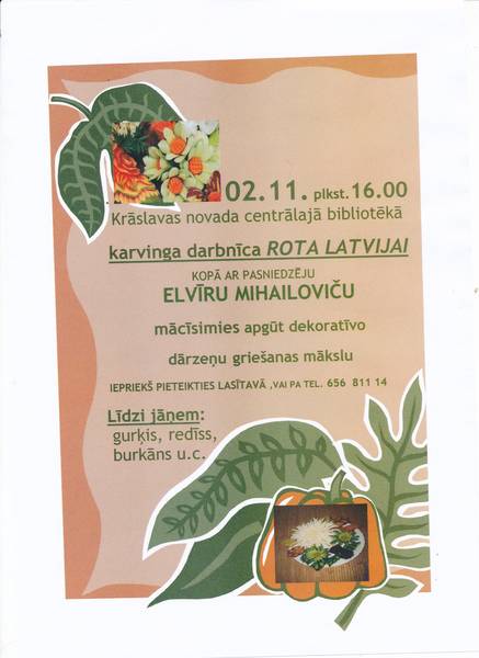 02.11.2017. plkst.16:00 Krāslavas novada centrālajā bibliotēkā tiek rīkota kartinga darbnīca ROTA LATVIJAI. Kopā ar pasniedzēju Elvīru Mihailoviču mācīsimies apgūt dekoratīvo dārzeņu griešanas mākslu. Iepriekš pieteikties lasītavā, vai pa telefonu 656 81114.