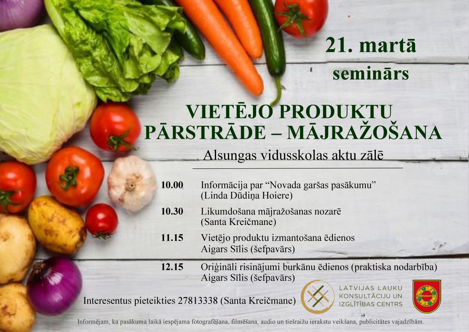 SIA LLKC Kuldīgas nodaļa š.g. 21. martā plkst. 10.00 rīko semināru vietējo produktu pārstrāde mājražošana Alsungas vidusskolas aktu zālē .