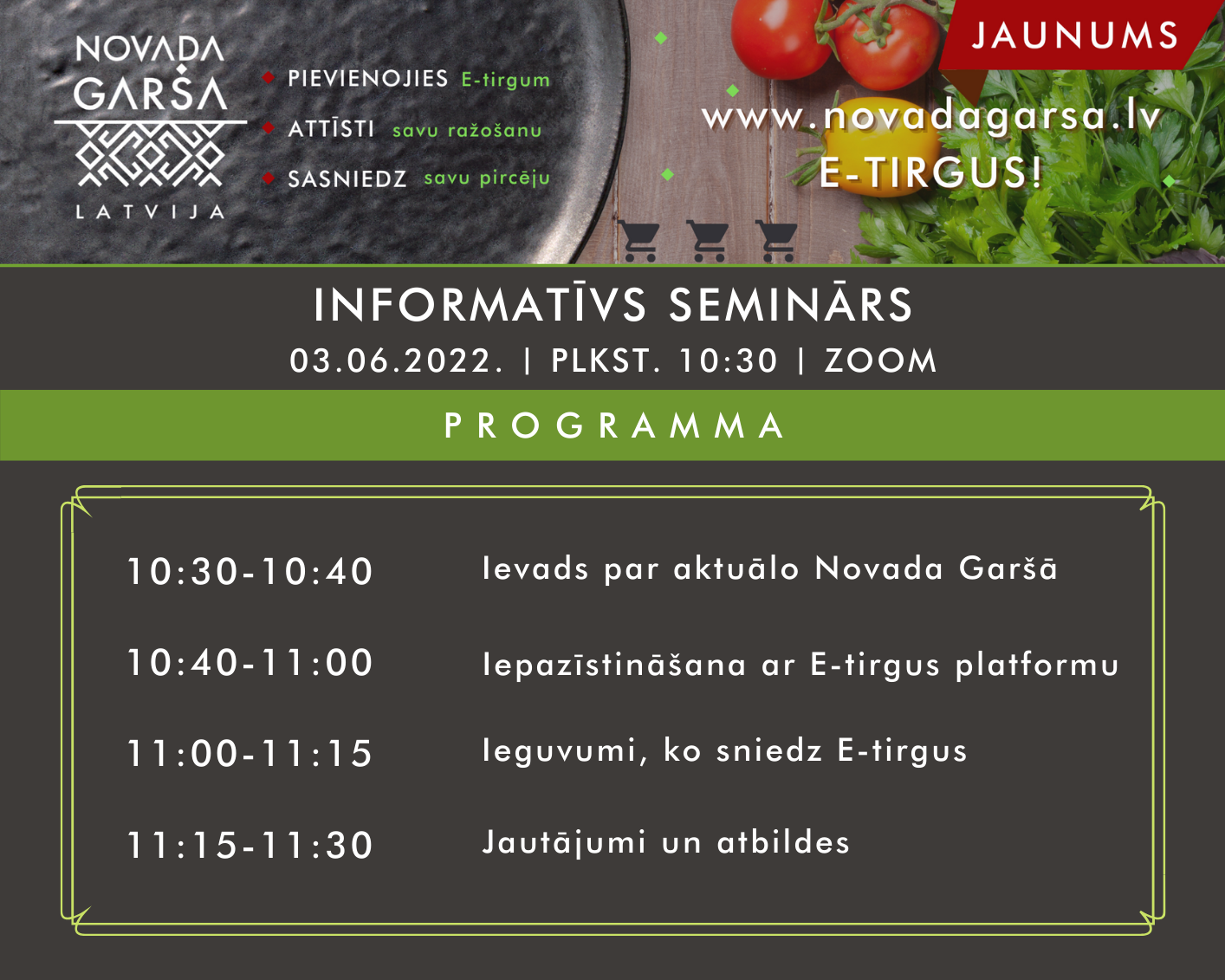 Priecāsimies Tevi redzēt šī gada 3. jūnijā plkst. 10.30 - 11:30 uz E-tirgus demonstrāciju, kas notiks attālināti - platformā Zoom.