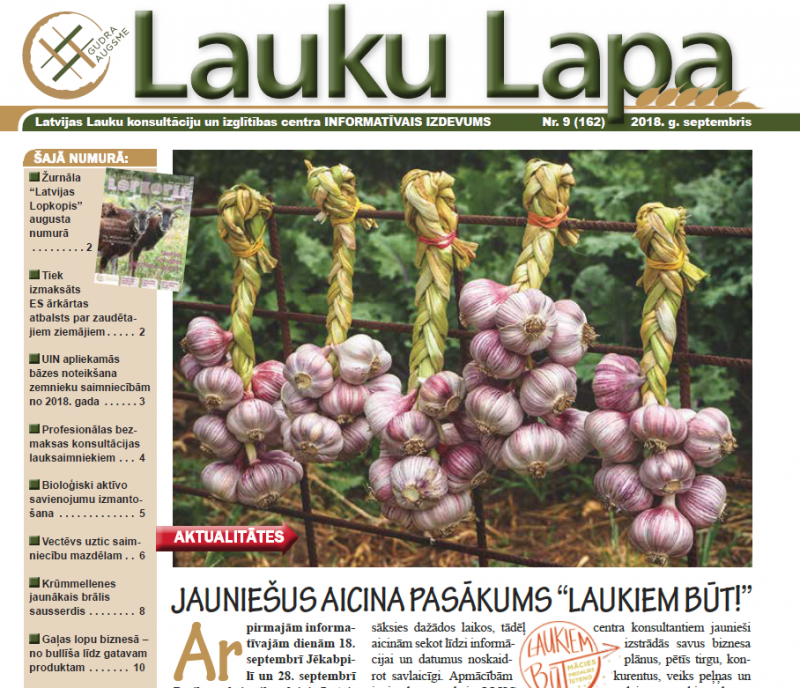 Iznācis LLKC informatīvā izdevuma “Lauku Lapa” septembra numurs. Veiksmīgas saimniekošanas pieredze no novadiem: par Janas Štūlbergas bioloģisko saimniecību “Dzirnas” stāsta LLKC Kuldīgas nodaļas konsultante Inese Blūma; par Vili Jansonu, kurš savu saimniecību Ērģemes pusē nodevis savam mazdēlam Kristapam Sulam, uzzinām LLKC Valkas nodaļas konsultantes Valdas Empeles sarunā.