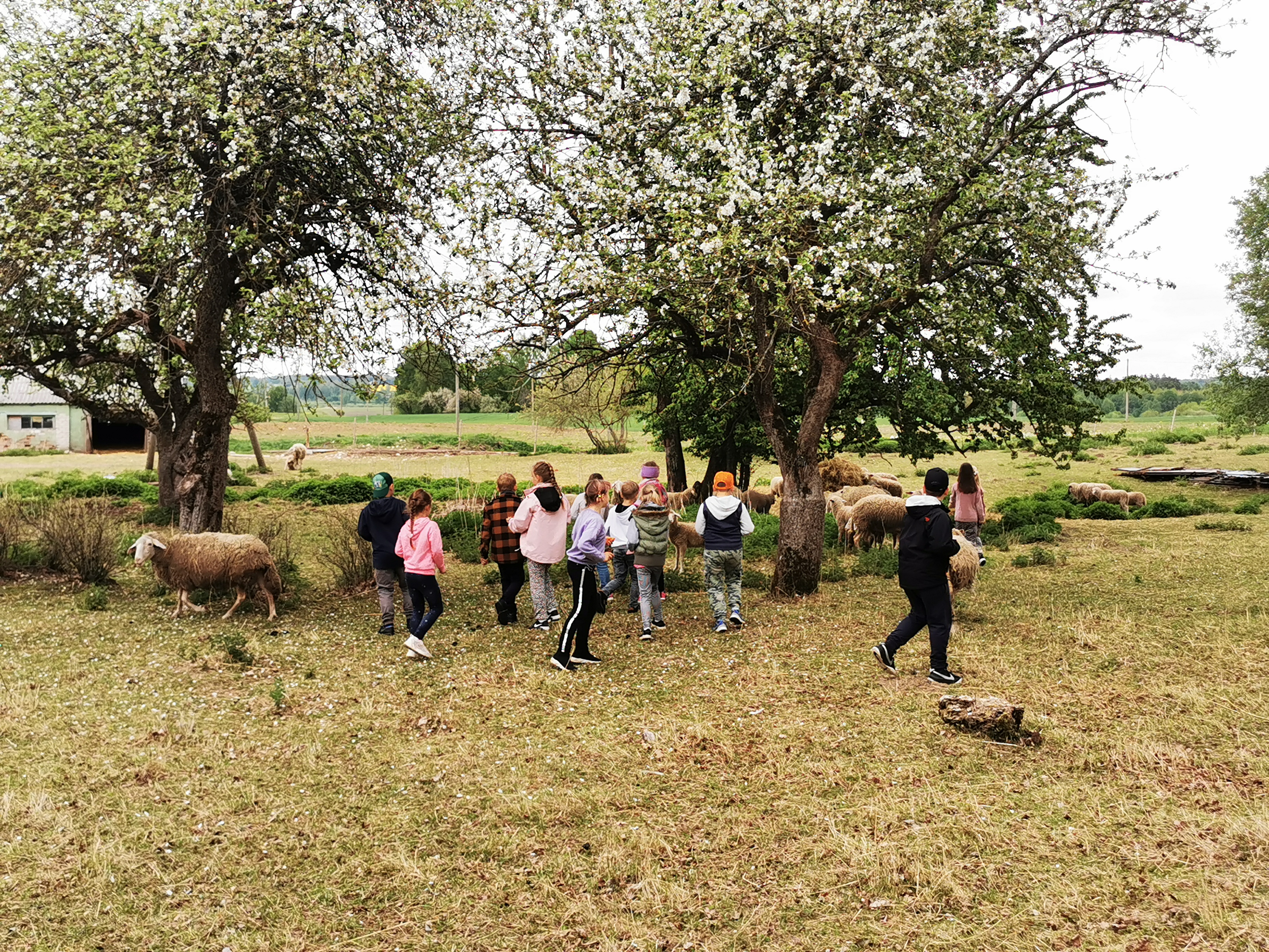 Vasarā sagaidījām ciemos arī savu pirmo skolnieku grupu. Satraukums bija liels, neslēpšu to. Viņi skrēja, klaigāja un izklaidējās. Un, protams, noveda panikā aitas, īpaši teķi, kurš bija ļoti satraucies. Labi, ka bija savā aizgaldā. Kamēr bērniem rokās bija sagatavotie našķi, aitas bija pat ļoti draudzīgas. Pasākums patika gan mums, gan bērniem.