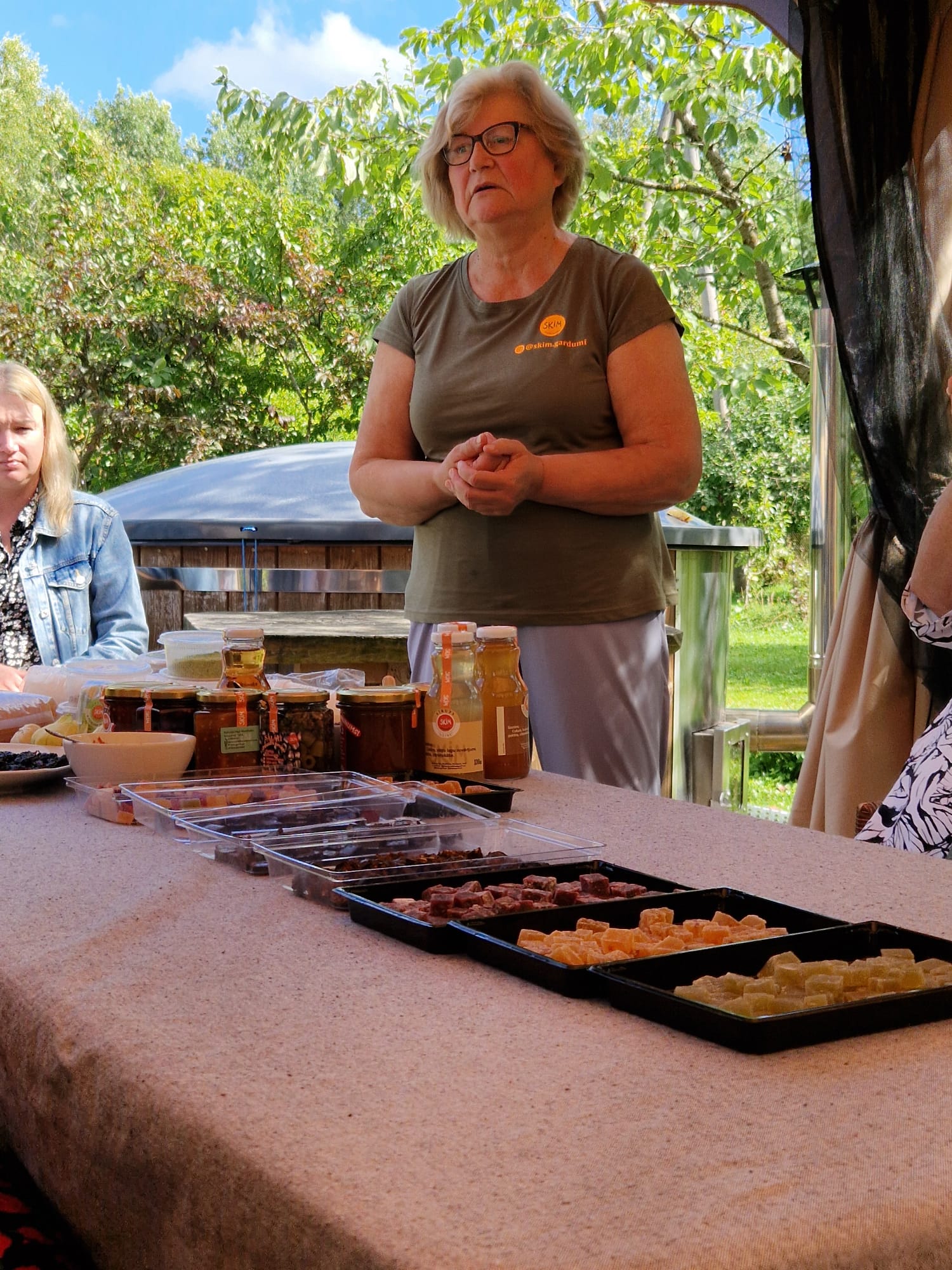 Tālāk ceļš veda uz “ Mežstrautiem” pie saimnieces Olgas Blumbahas, kur tiek gatavoti apmēram 25 dažādi produkti – dabīgo sulu želejkonfektes, dažādas mērces un sāls ar dažādām piedevām ar zīmolu “SKIM gardumi” . Kā izejvielas tiek izmantotas saimniecībā saražotās ogas un augi, kā arī meža ogas. Čakli darbojoties, produkcijas klāsts regulāri tiek papildināts ar jaunām garšām. Saimniece nebaidās no eksperimentiem. Produkcija tiek tirgota vietējā tirdziņā, un ir iespēja saņemt sūtījumu arī pakomātā.
