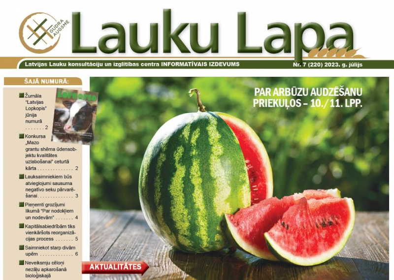Informatīvā izdevuma “Lauku Lapa” jūlija numurā mūsu augkopības speciālisti raksturo situāciju laukos pēc ilgstošā sausuma perioda un tā potenciālo ietekmi uz gaidāmo ražu, kā arī informējam par Zemkopības ministrijas paredzētajiem atvieglojumiem, sniedzot palīdzību sausuma negatīvo seku pārvarēšanai.