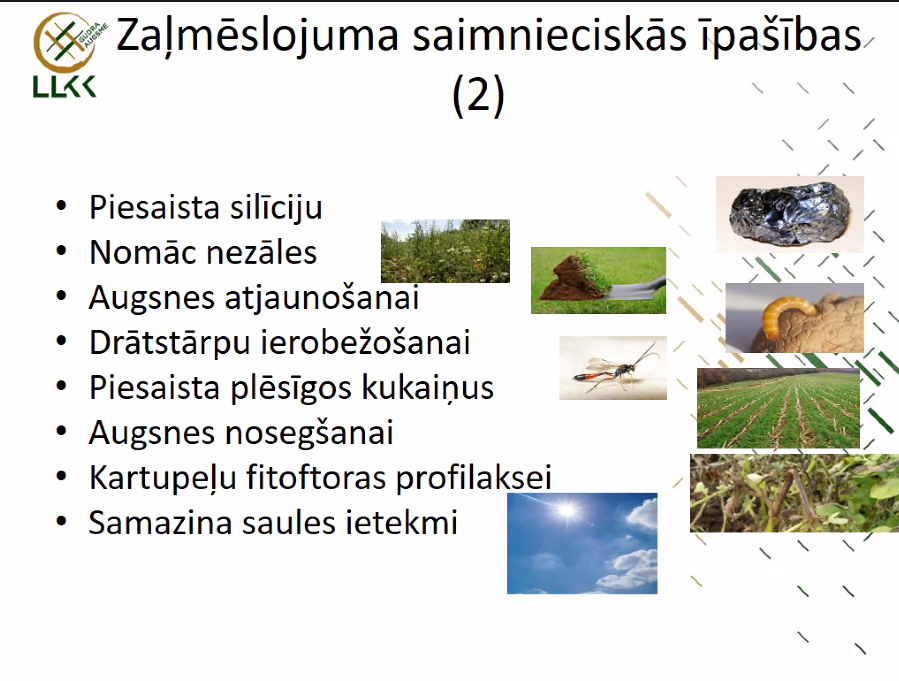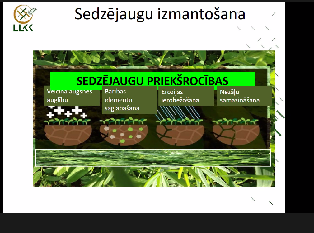 Zaļmēslojuma augu audzēšana ir viena no vides aizsardzības tendencēm, kas palīdz lauksaimniecības nozarei virzīties uz ilgtspējību, saglabājot resursus un apmierinot pieprasījumu pēc pārtikas. Meklējot veidus, kā pāriet uz efektīvu un videi draudzīgu ražošanu, mūsdienu lauksaimnieki saskaras ar vairākām problēmām. Viena no tā ir saglabāt augsnes auglību, vienlaikus izmantojot mazāk ķīmisko vielu. Šīs problēmas risinājums būtu apsvērt zaļmēslojuma kultūru audzēšanu, tādēļ 11. oktobrī tika rīkots Zoom tiešsaistes seminārs par zaļmēslojuma augu audzēšanu, to īpašībām un funkcijām augsnes veselības un auglības uzlabošanā. Semināra lektors bija Māris Narvils, LLKC dārzkopības speciālists. Lekcijas sākumā klausītājus iepazīstināja ar zaļmēslojuma augu dažādo iedalījumu – to terminoloģiju un pamata saimnieciskajām īpašībām. Turpinājumā stāstīja par galveno un populārāko kultūraugu izmantošanas iespējām, un noslēguma daļā par to, kā izvēlēties atbilstošu zaļmēslojuma kultūru konkrētā situācijā un praktisko – iestrādes veidiem. M. Narvils uzskata, ka Latvijā audzējam mazāk šo kultūru, nekā vajadzētu to darīt, jo ieguvums ir būtisks, sevišķi, ņemot vērā to, ka arī lopu skaits arvien samazinās, līdz ar to arī kūtsmēslu daudzums, tādēļ ieteicams sākt vairāk izmantot zaļmēslojuma augus.