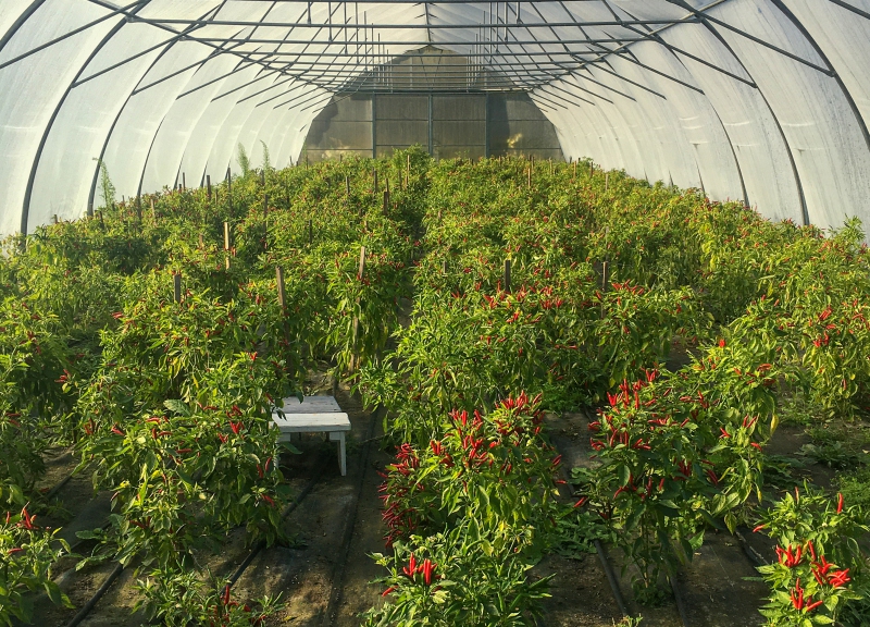 Vēl saimniecības audzēto augu klāstā ļoti nozīmīga vieta ir ierādīta čili pipariem, tiem šeit atvēlēta ap 300 kvadrātmetru liela siltumnīca. No izaudzētajiem čili tad arī top daudzi marinējumi. Bet saimniecībā ierīkotajā veikalā var iegādāties dažādus gurmē un garšaugu ievārījumus, garšaugu sāli un, protams, saimniecībā ievāktas un safasētas dažādas eksotiskas tējas. Tomēr saimniecības galvenais ienākumu avots, ka stāsta saimniece Heli, ir pavasarī dažādu garšaugu un eksotisko augu stādu pārdošana. Viņa aicina arī mūs, ja ir interese iegādāties tos saimniecības izveidotajā e-veikalā. Šī iespēja ievērojami ir palielinājusi saimniecības apgrozījumu.