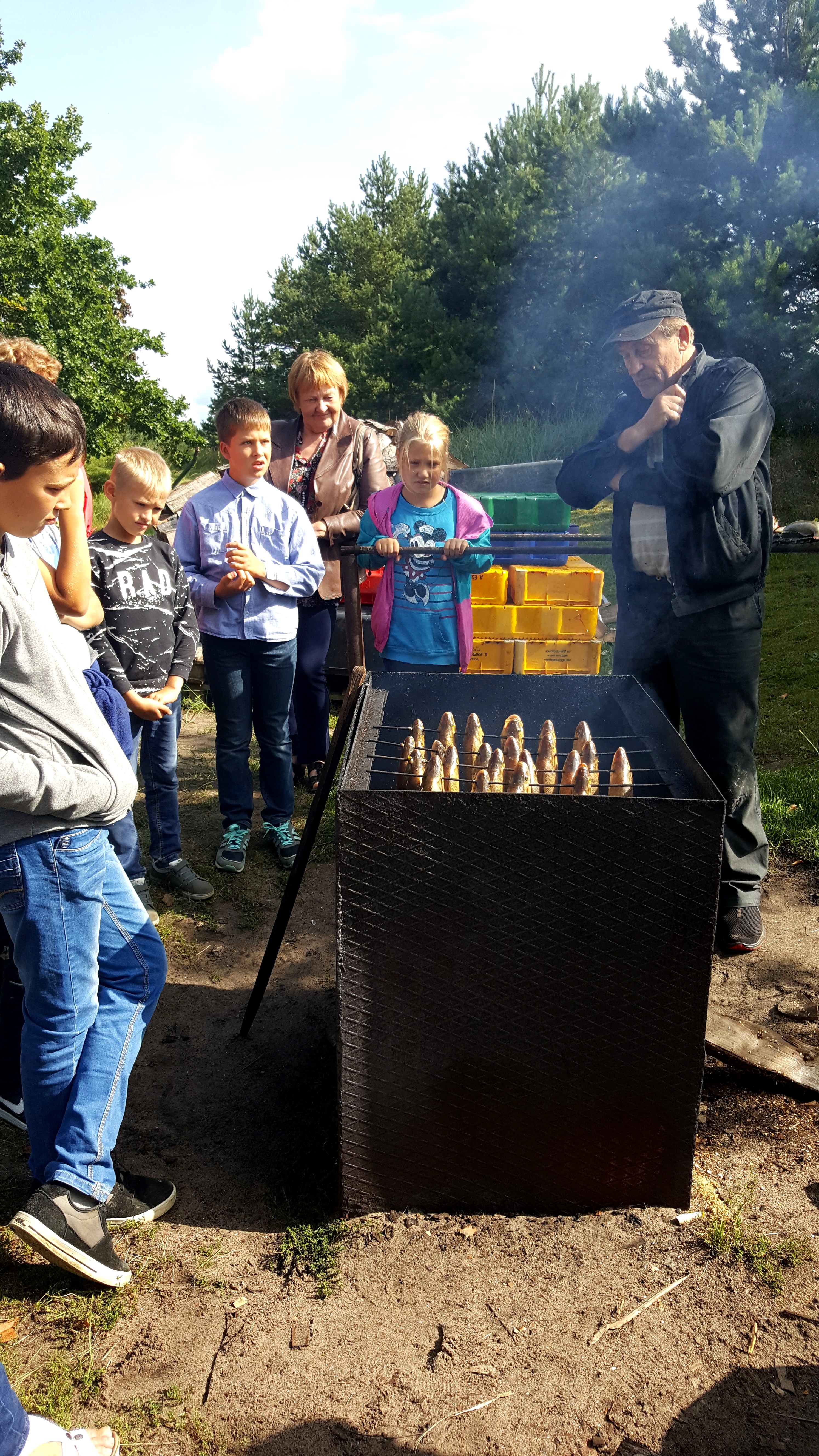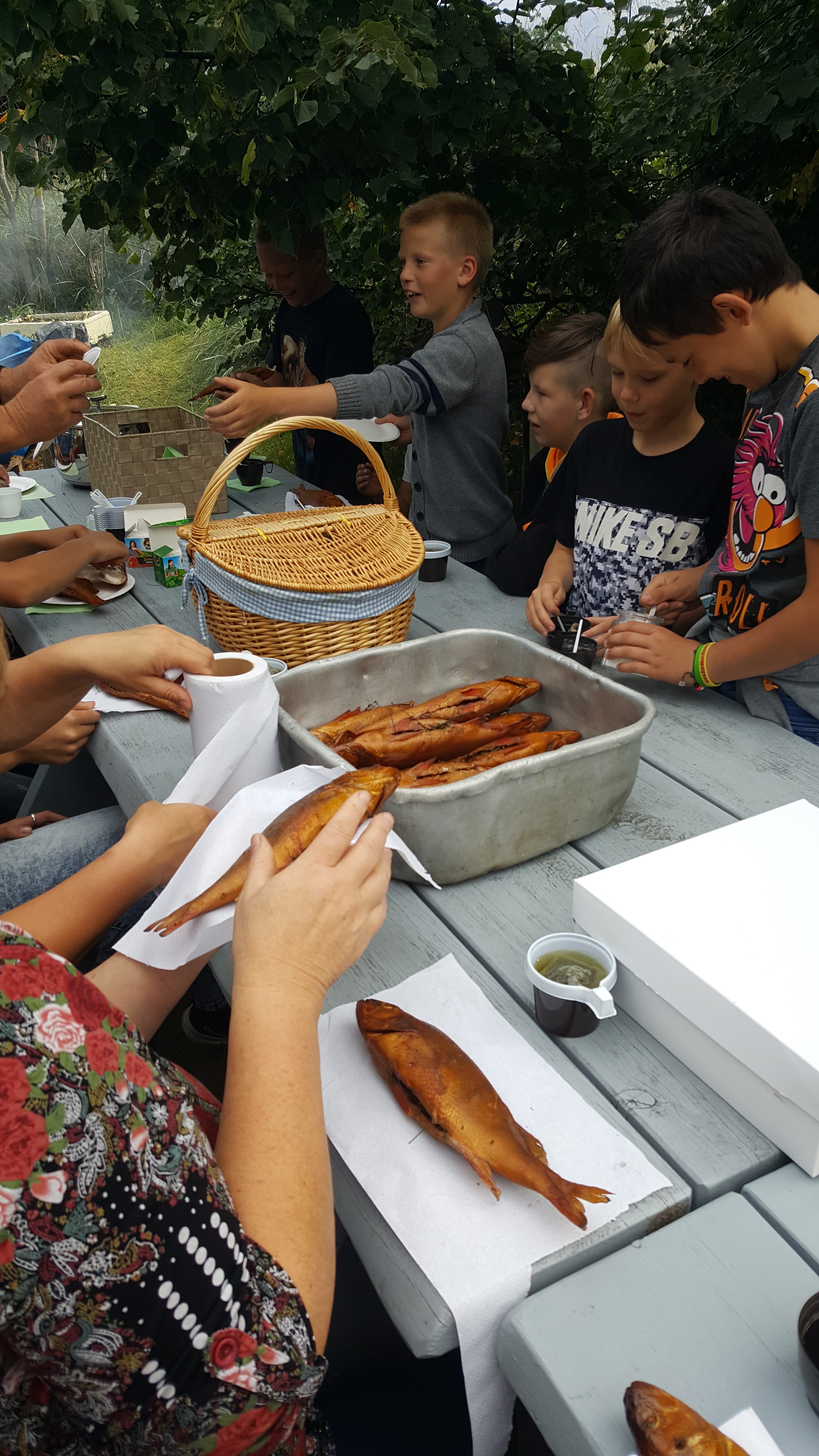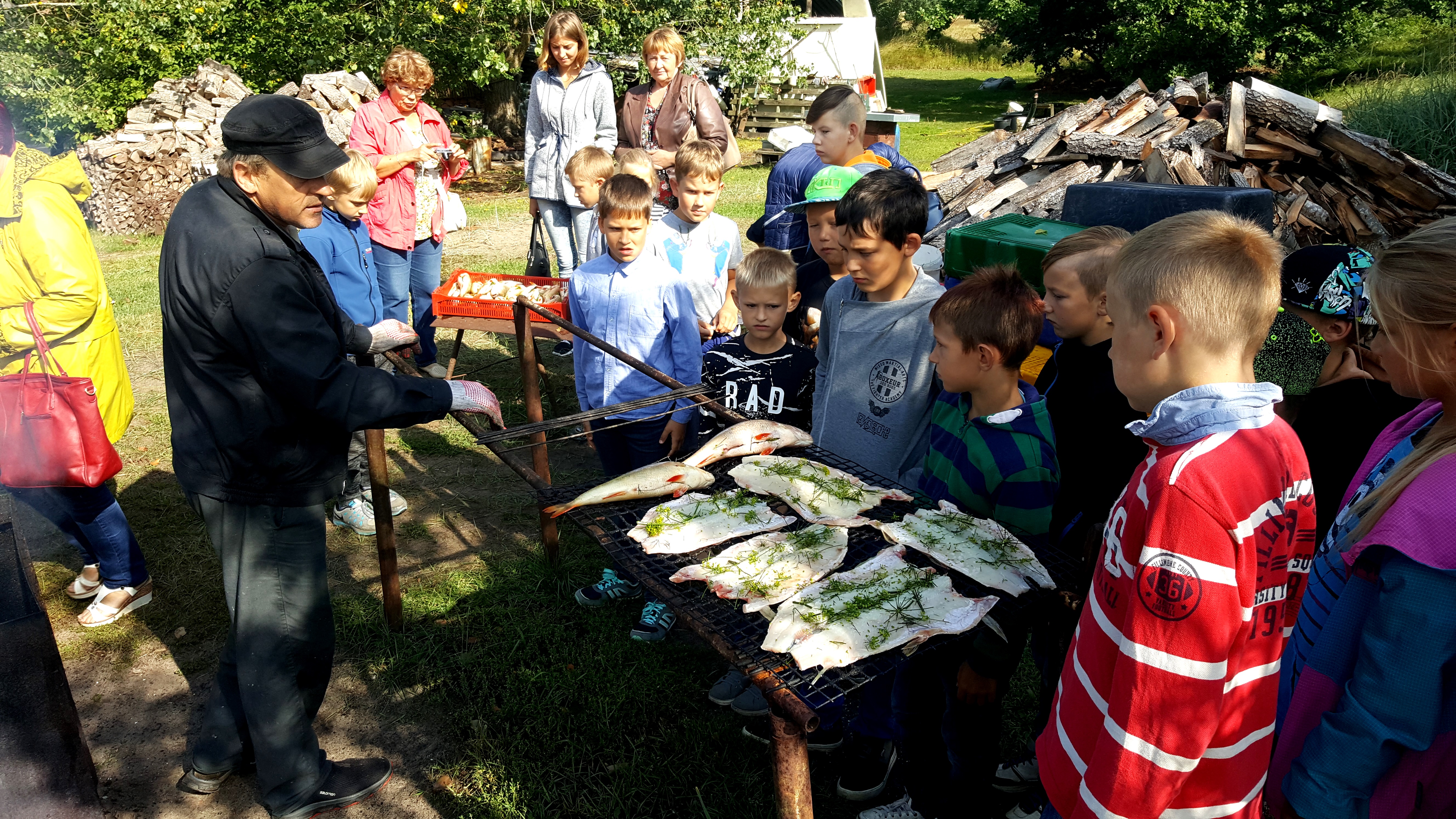 Esam gatavi baudīt paveikto un atgriežamies Dzintara saimniecībā. Saimnieks paziņo, ka viena zivs esot iekritusi ugunī. Vai jūs zināt, kā tādu zivi sauc? Lutriņu mazpulcēni jums atbildētu, ka par “Dieva doto”. Patīkamā viesmīlībā baudām svaigi kūpinātās zivis un pārrunājam redzēto un dzirdēto. No Pāvilostas atvadāmies pie jūras.