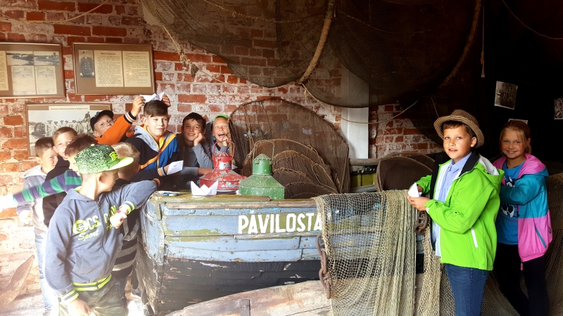 Dienu sākām ar Pāvilostas novadpētniecības muzeja apmeklējumu, kur mūs sagaidīja muzeja vadītāja Irina Kurčanova. Irina mūs laipni iepazīstināja ar Pāvilostas novadu, izrādīja muzeju, parādīja vairākus senus darba rīkus, tai skaitā arī zvejas rīkus. Laivu mājā bija iespēja redzēt milzīgu nēģu murdu, kā arī iemēģināt roku tīklu lāpīšanā. Vairāki dalībnieki bija ieinteresēti tīklu lāpīšanā, un pēc tam atzina, ka tas neesot bijis nemaz tik viegli, kā no malas izskatās. Katrs dalībnieks Irinas vadībā arī uzlocīja papīra kuģīti, kuru atvadoties ielaida Sakas upē.