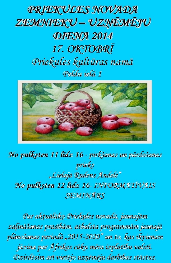 Rudens ieskaņā Priekules kultūras namā jau trešo gadu notiks „Zemnieku – uzņēmēju diena 2014”. 17.oktobrī no pulksten 11 novada iedzīvotāji un viesi aicināti apmeklēt vietējo ražotāju, amatnieku un uzņēmumu veidoto „Lielo Rudens Andeli”.