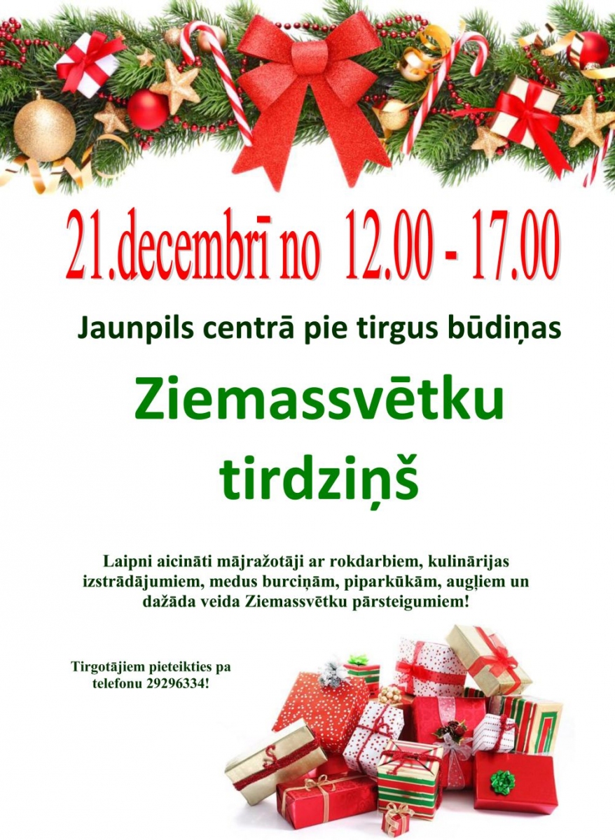 Jaunpils centrā pie tirgus būdiņas Ziemassvētku tirdziņš. Laipni aicināti mājražotāji ar rokdarbiem, kulinārijas izstrādājumiem, medus burciņām, piparkūkām, augļiem un dažāda veida Ziemassvētku pārsteigumiem!