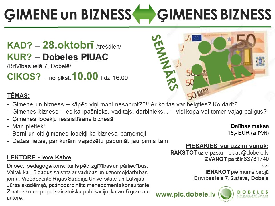 Datums: 28. Oktobris, 2015Reģions: ZemgaleVieta: Dobeles Pieaugušo izglītības un uzņēmējdarbības atbalsta centrsAdrese: Skatīt karti lielākā izmērā Nozare: UzņēmējdarbībaKontaktinformācija: tālr. 63781740Reģions filtram: Dobeles novads