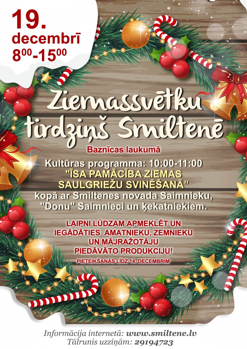 Aicinām ikvienu apmeklēt Ziemassvētku tirdziņu Smiltenē! Tirdziņš notiks šī gada 19.decembrī no plkst. 8.00–15.00 Smiltenes pilsētas centrā.